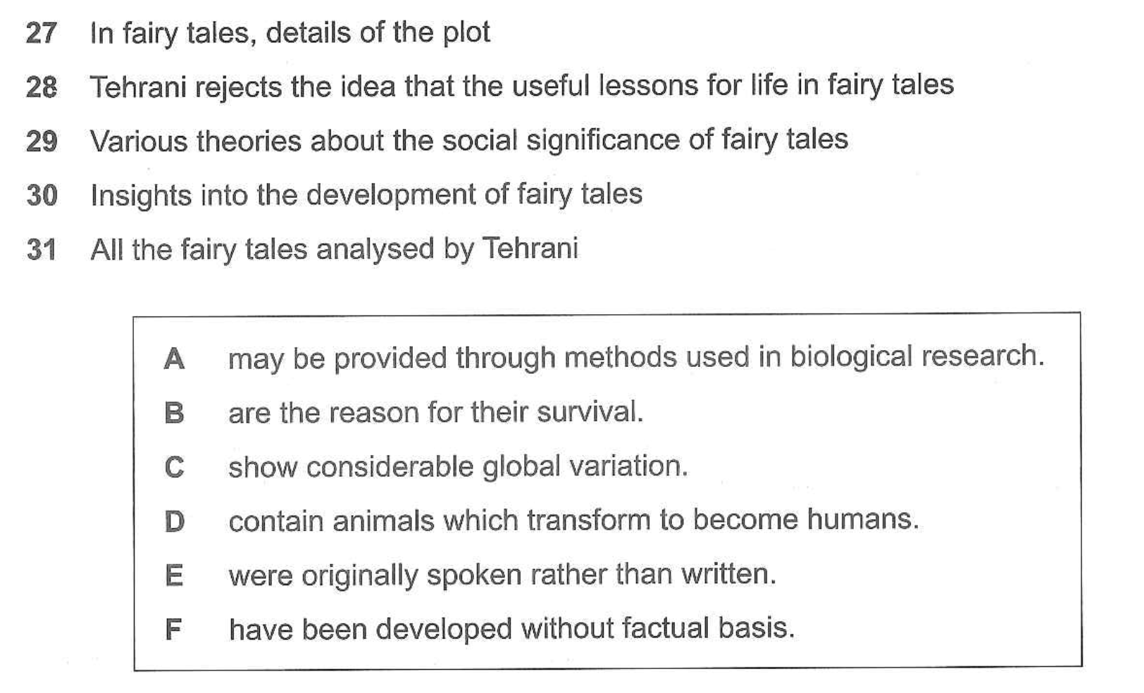 Write the correct letter A - F in the boxes 27 - 31