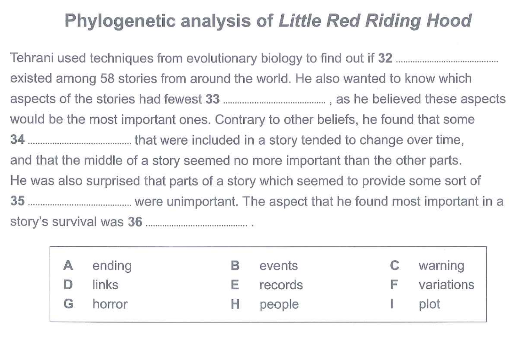 Write the correct letter from A - I in the boxes 32 - 36