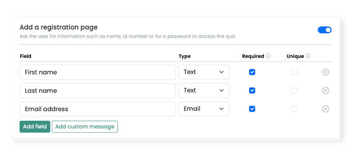 Scroll down to Add a registration page and select the toggle to include a registration page at the start of your test. Learn more about configuring the registration page.